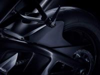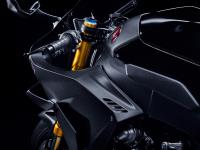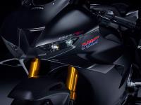 The low-set fuel tank has been reshaped for improved knee grip while cornering. It also carries an extra 0.4L capacity. An extremely compact frame and engine equals a small frontal area – with MotoGP-spec. ram-air duct that feeds directly through the headstock – that slices cleanly through the air. New, more aggressive and muscular styling is led by forward-set winglets that use aerodynamic bumps to maintain downforce on the front tyre, for consistent grip and feel through every corner and reduced lift on exit but with 10% less turning effort at speed. And the under cowl extends close to the rear tyre, forcing air downward, minimising drag in the dry and channelling water away in the wet, improving traction.